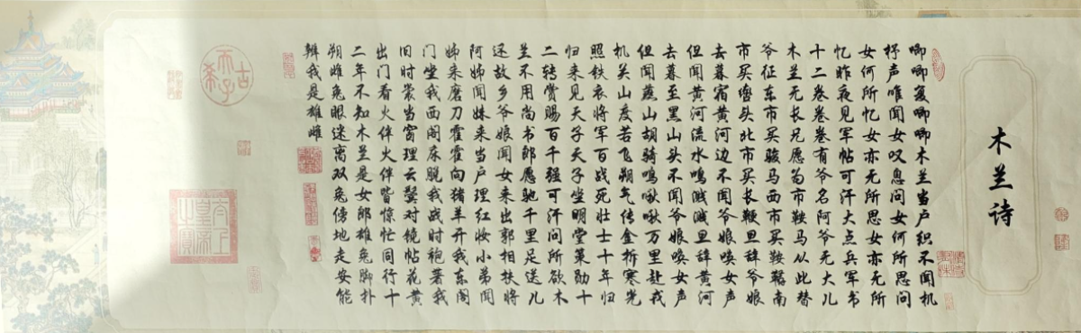 “花开净土 书香全域” 阿坝女职工主题阅读活动获奖作品展播 (第二十三期) 阅读点亮梦想,花香共与书香。2024年“花开净土 书香全域”阿坝女职工主题阅读活动已圆满结束。本届活动,全州共有2000多家单位、3000多名女职工参加,组委会收到阅读作品近300件。经初审、复审、网络投票等程序严格筛选,最终评选出获奖作品41件,其中一等奖8个,二等奖11个,三等奖22个。一篇篇美文犹如一杯清茶,沁人心脾;一封封家书,犹如一缕冬阳,温暖心田;一张张照片,犹如一绢画卷,诉说时光;一幅幅书画,犹如一捧静雅,可吟梵音;一段段表演,犹如一樽陈酿,微醺恰饮…… 新的一年,欢迎各位女职工与我们一起徜徉书海、乐享墨香,共同让精神之花书香全域、繁茂向荣,巾帼之志花香净土、履践致远! 奖项:书画类一等奖 姓名:杨小燕 单位:红原县麦洼乡小学 木兰诗